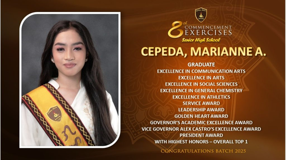 My name is Marianne A. Cepeda of STEM 12-Amity, and I am humbled to stand here and have achieved this unexpected distinction. First and foremost, I thank God for guiding me on this journey. Seeing my Grade 10 valedictorian inspired me to pray for academic success. I worked hard, prayed consistently, and achieved top ranking in Grade 11. Facing new challenges in Grade 12, I continued to pray and work hard, trusting in God’s grace and my own efforts, and succeeded again. This proves that hard work combined with faith in God yields amazing results.